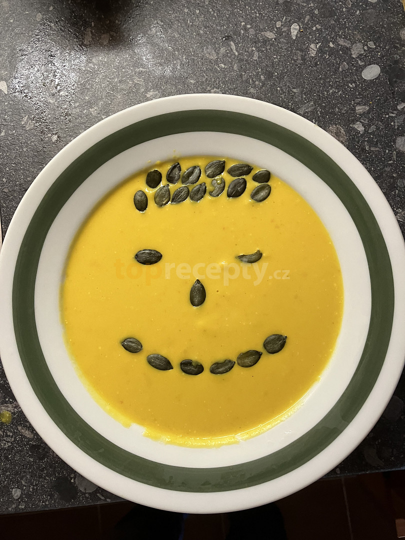 dýně hokkaido, mrkev, celer, cibule, olej, voda, bujón zeleninový, smetana 12%, smetana zakysaná, semínka dýňová, pažitka