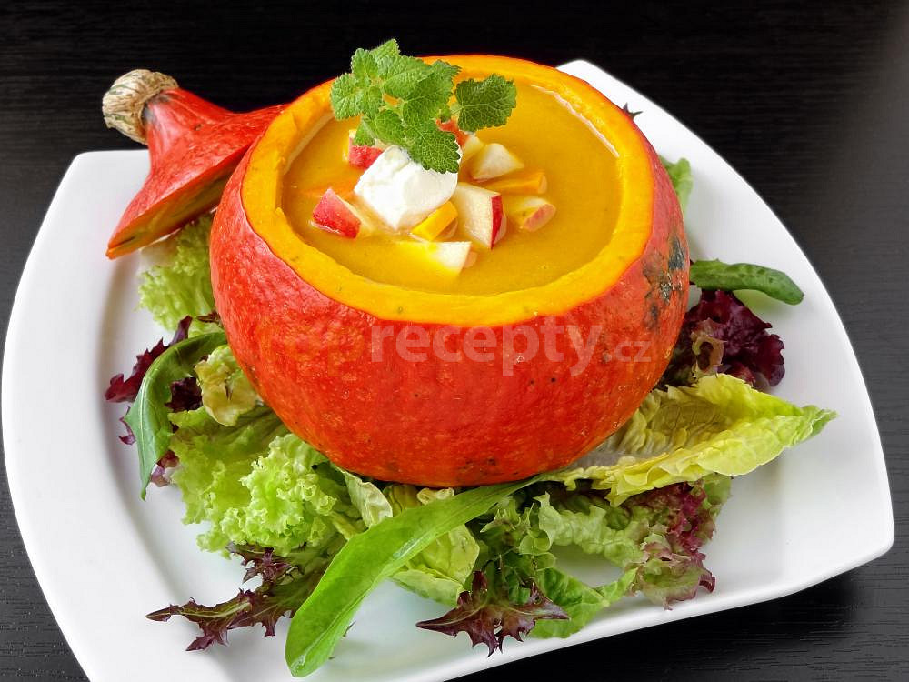 dýně, cibule, česnek, jablko, citron, máslo, smetana zakysaná, zázvor čerstvý, vývar zeleninový, sůl, pepř mletý, koření kari, meduňka