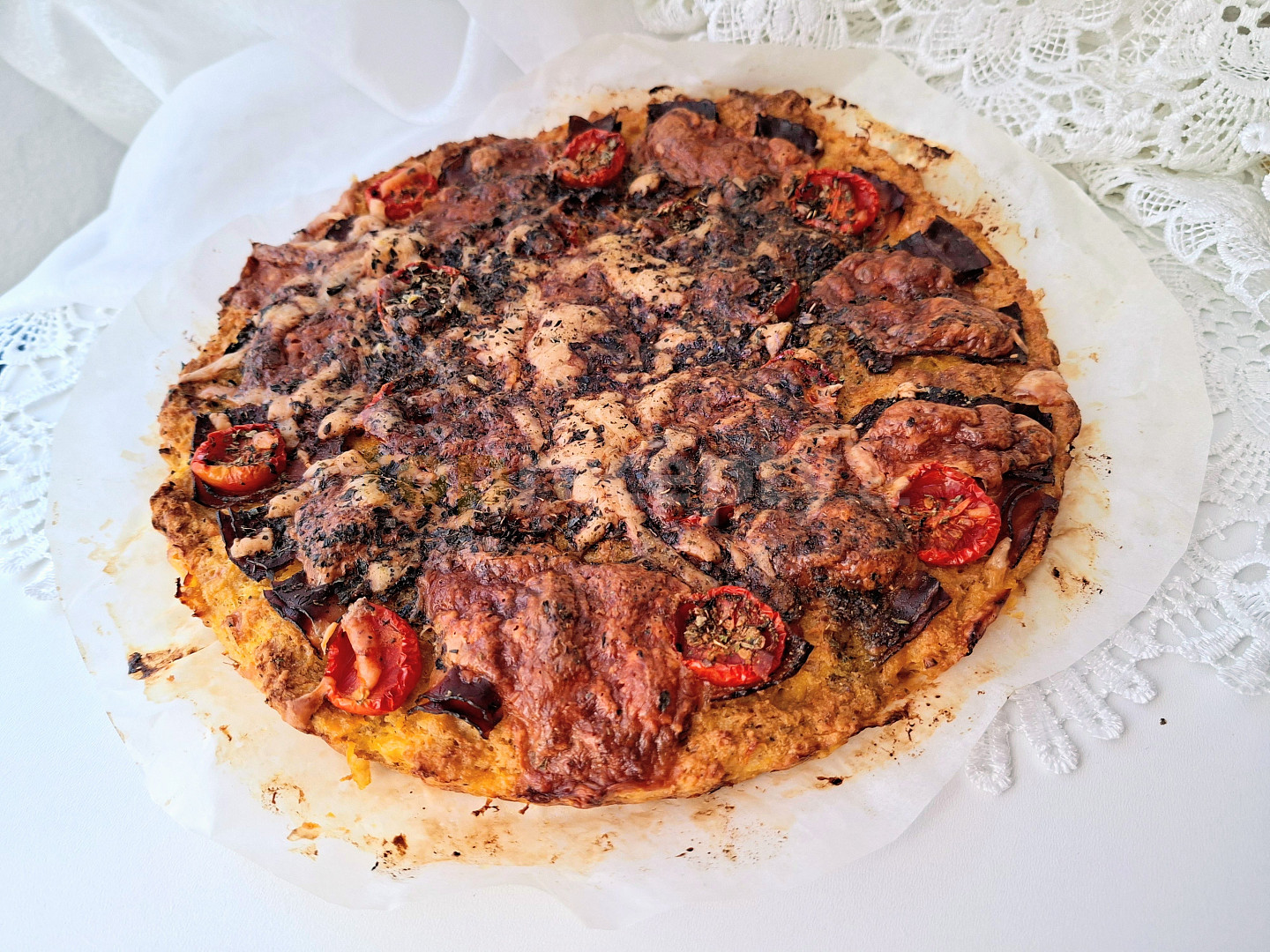 dýně, vejce, vločky ovesné, psyllium, jogurt bílý, máslo, sůl, pepř mletý, česnek, slanina anglická, sýr mozzarella, sýr gouda, rajče, koření pizza