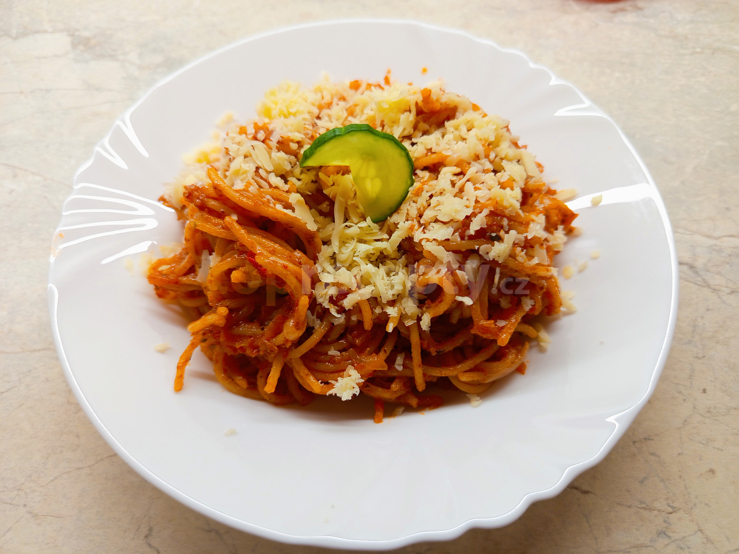 těstoviny špagety, těstoviny špagety, cibule, mrkev, petržel, slanina, salám gothaj, kečup sladký, sůl, koření na špagety, olej, sýr