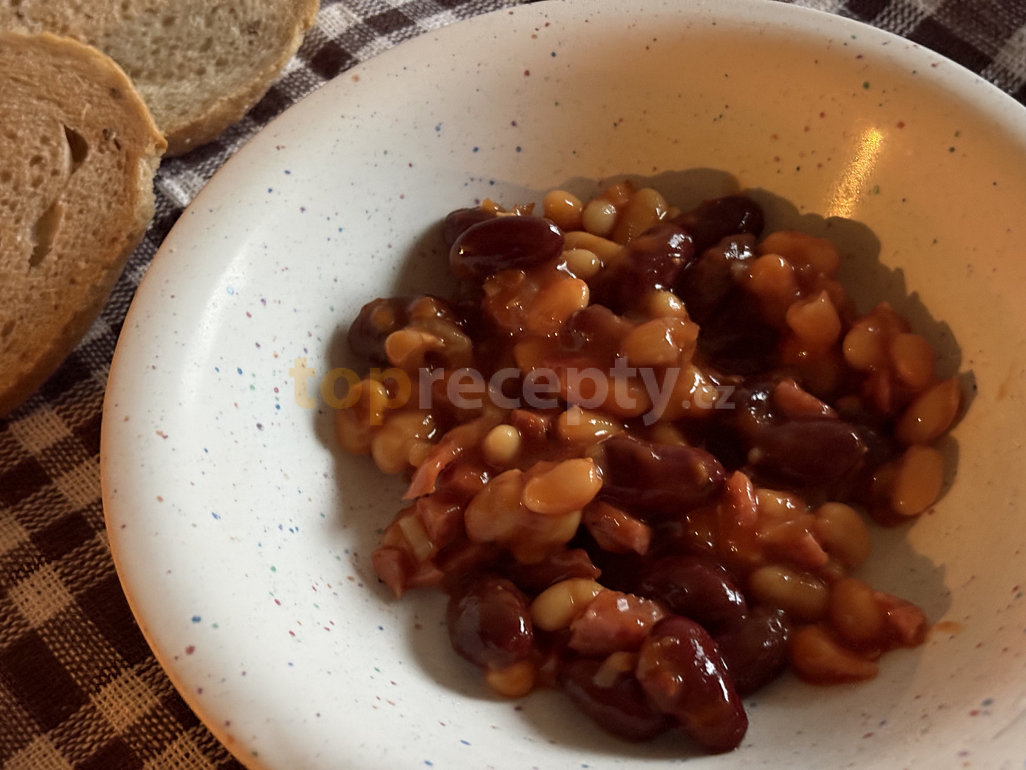 fazole, pyré rajčatové, vývar hovězí, mouka hladká, olej, bobkový list, bazalka čerstvá, koření nové koření, cukr, sůl, ocet, klobása, slanina anglická