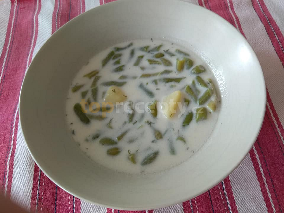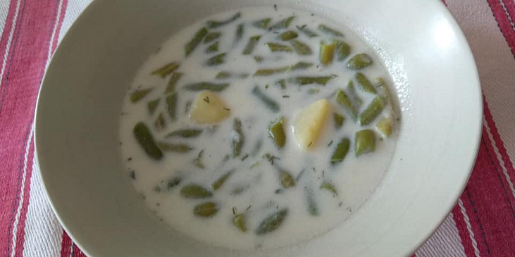 fazolky zelené, brambory, voda, sůl, smetana kysaná, šlehačka, mouka polohrubá, kopr, ocet, cukr