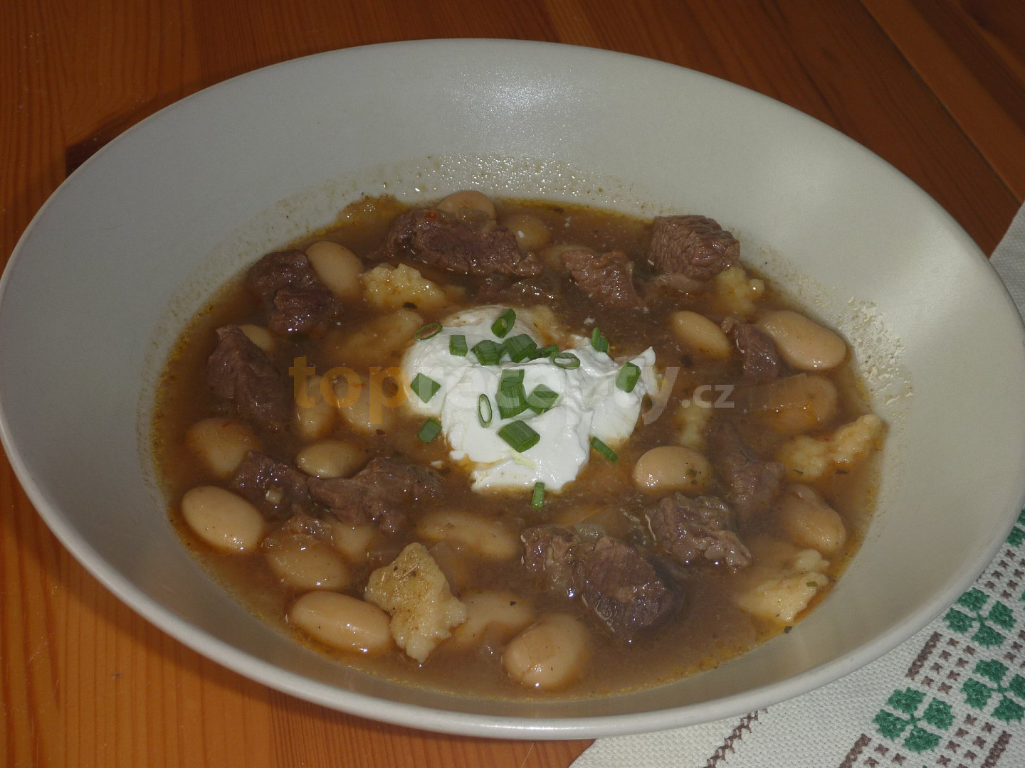fazole, krk hovězí, cibule, olej, paprika sušená sladká, pepř mletý, česnek, protlak paprikový, sůl, paprika čerstvá zelená, rajče, feferonka, voda, masox hovězí, smetana zakysaná