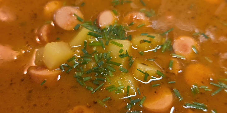 párky frankfurtské, cibule, sádlo, brambory, masox hovězí, paprika sušená sladká, mouka hladká, česnek, pepř mletý, nať petrželová, sůl
