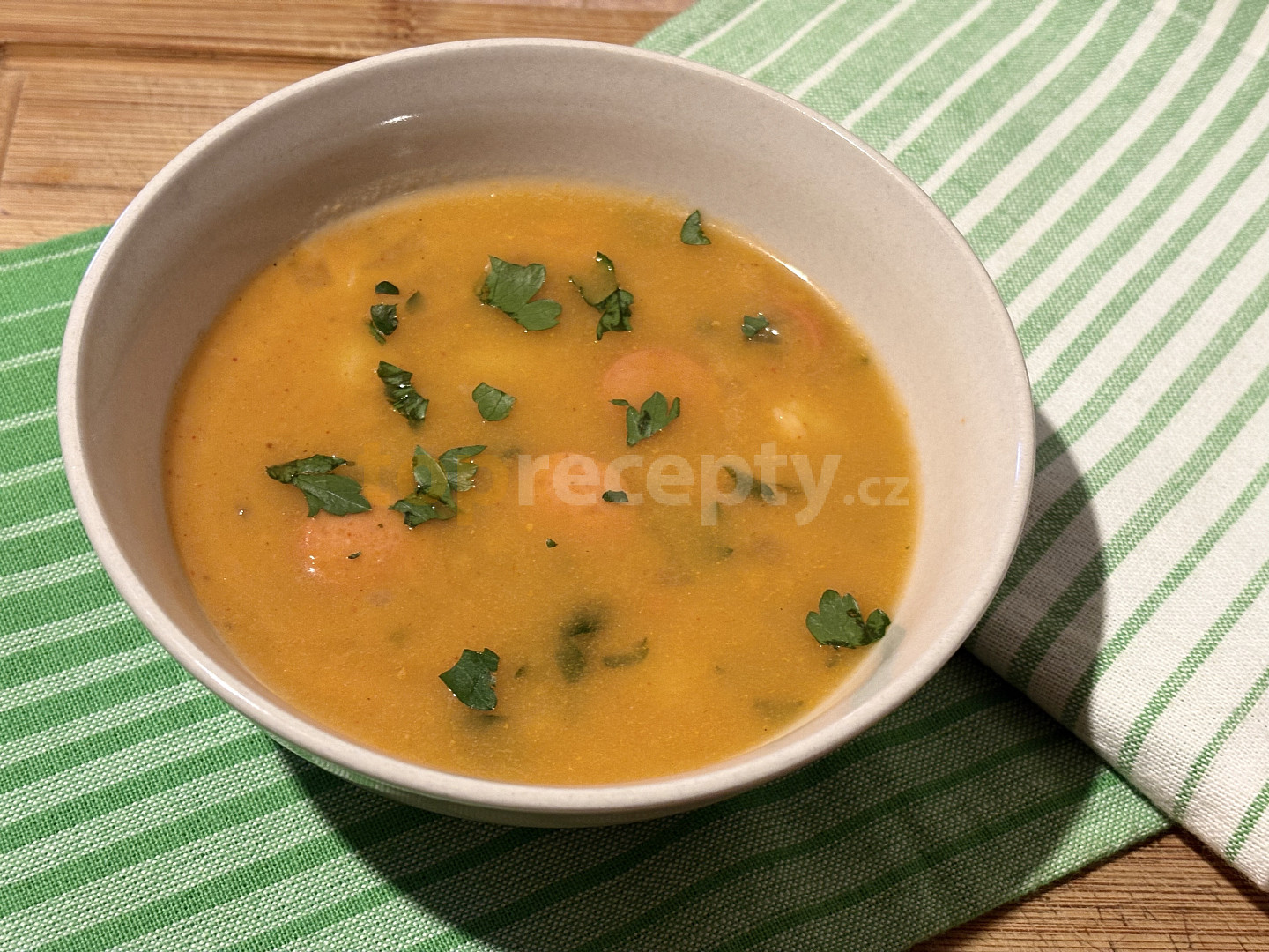 párky, tuk, cibule, mouka hladká, paprika sušená sladká, vývar masový, brambory, koření polévkové, nať petrželová, pepř mletý