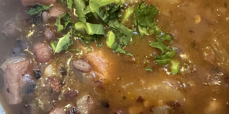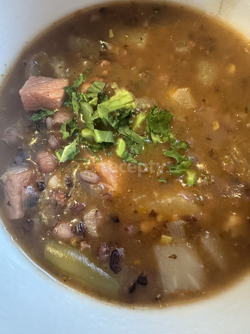 párky, fazole bílé, cibule, brambory, česnek, sádlo, mouka hladká, paprika sušená sladká, paprika sušená pálivá, vývar masový, libeček, majoránka, sůl, pepř mletý, kmín celý