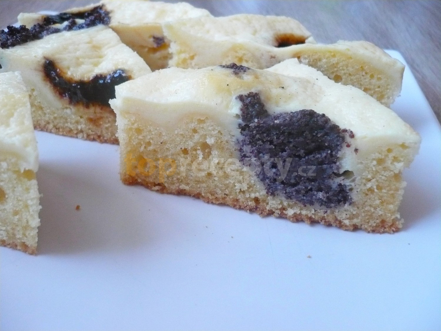 Nahoře jen tvarohová hmota a nastřídačku povidla s makovou náplní, bez těsta.