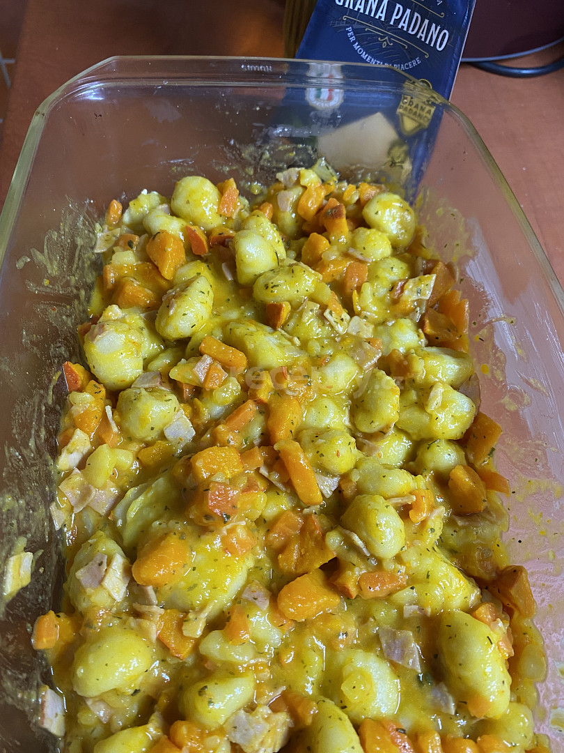 dýně hokkaido, gnocchi, sýr parmazán strouhaný, mléko, máslo, vejce, cibule, kurkuma, sůl, pepř mletý, nať petrželová, olej
