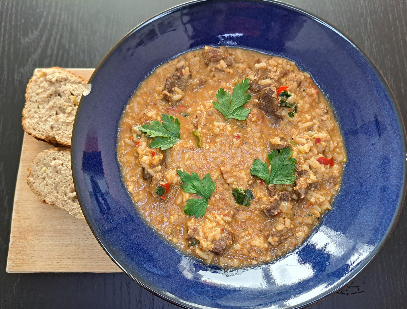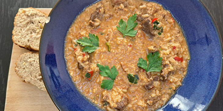 kližka hovězí, cibule, česnek, rajče, rýže, bobkový list, vývar hovězí, olej, sůl, pepř mletý, ořechy vlašské, feferonka, koriandr, pískavice, povidla švestková, petrželka, cibulka jarní, šťáva citronová