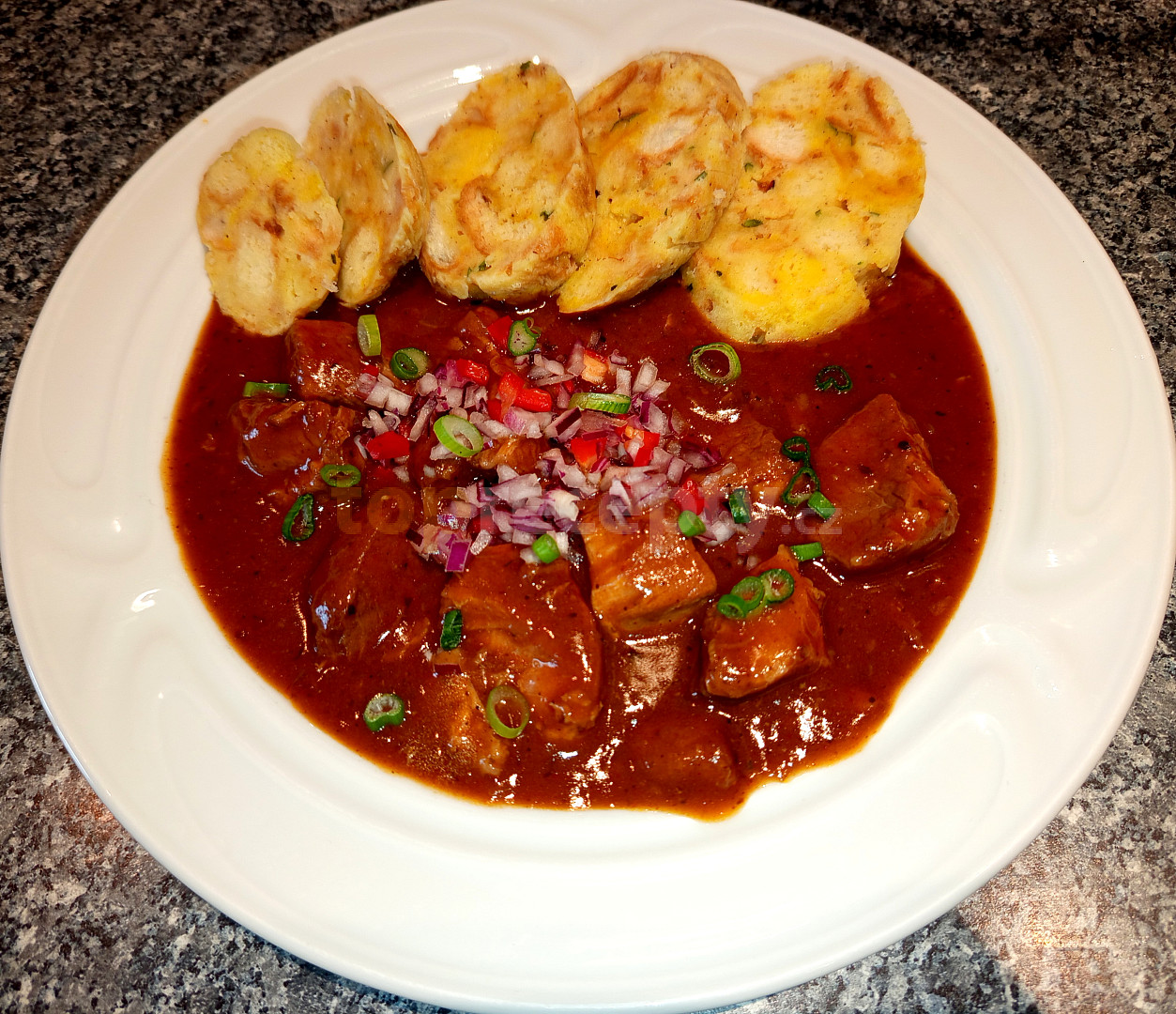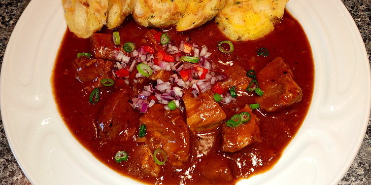 kližka hovězí, cibule, česnek, protlak rajčatový, vývar hovězí, paprika sušená sladká, kmín drcený, pepř mletý, masox, tymián sušený, paprika sušená pálivá, majoránka,