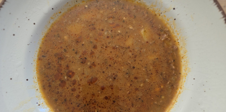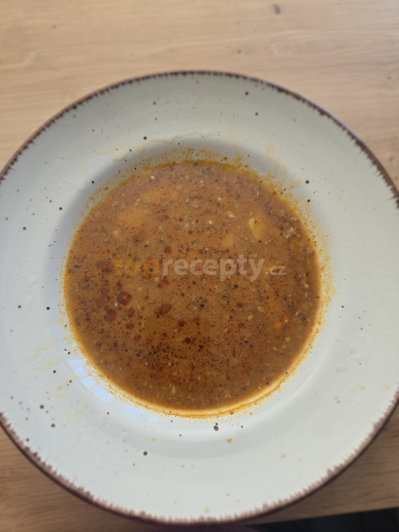 olej, cibule, paprika sušená sladká, maso hovězí mleté, sůl, pepř, kmín celý, vývar hovězí, česnek, majoránka, brambory, mouka hladká