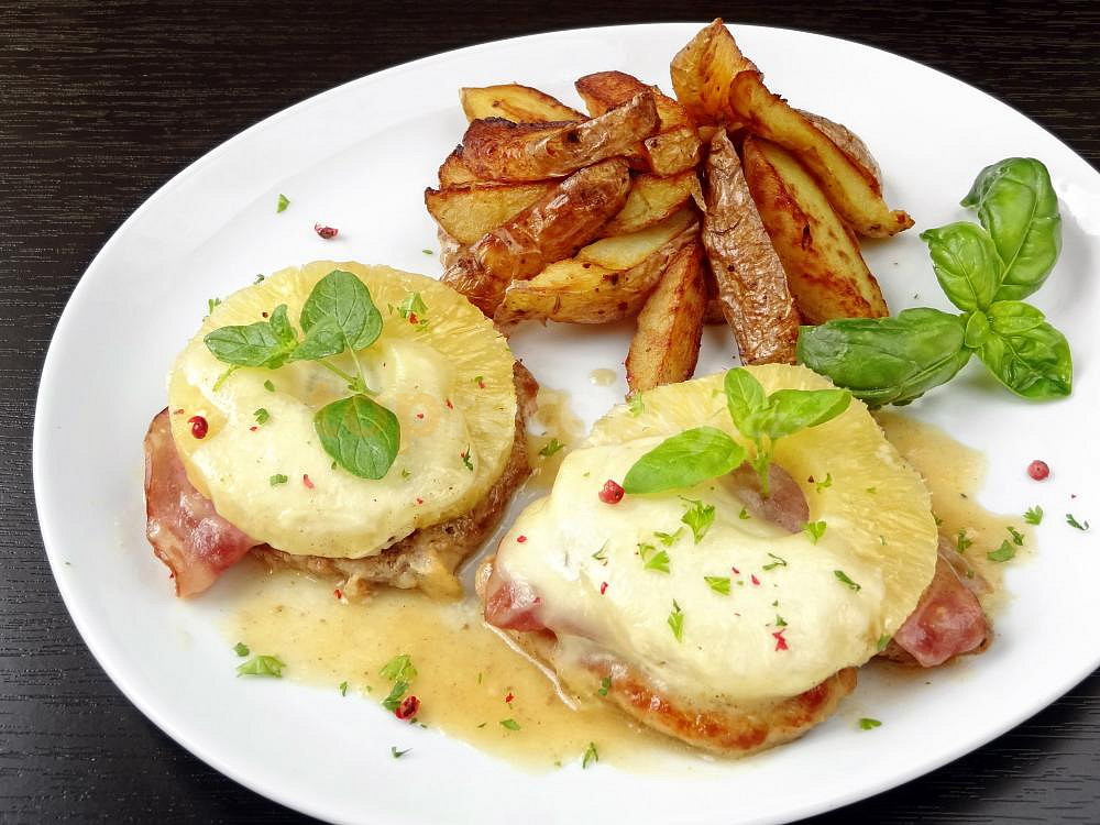 pečeně vepřová, šunka uzená, kompot ananasový, kompot ananasový, sýr mozzarella, sůl, pepř mletý, pepř růžový, petrželka, olej