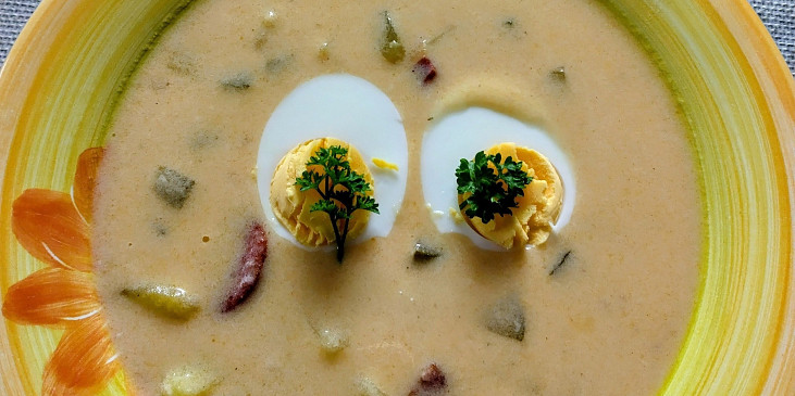 brambory, šunkový kabanos, vejce, bobkový list, pepř, koření nové koření, mléko, mouka hladká, sůl, ocet, cukr