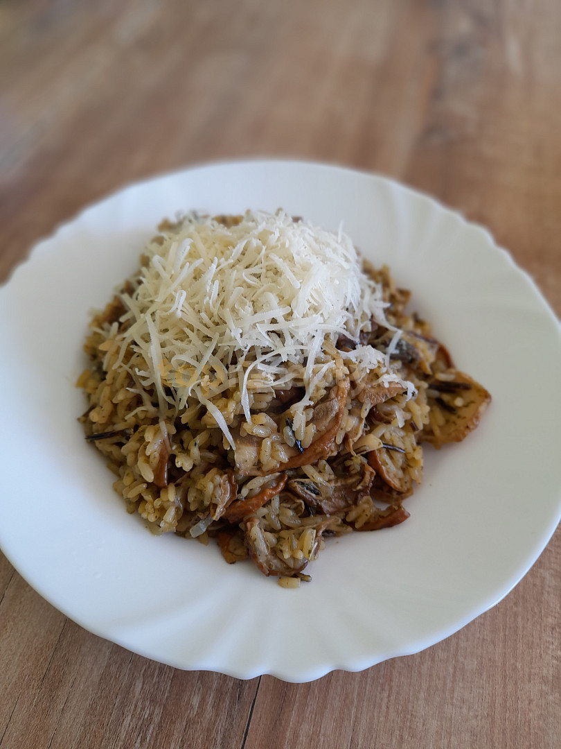 rýže, houby lesní, máslo, olej olivový, cibule, česnek, vývar zeleninový, víno bílé suché, sůl, pepř mletý, parmazán, čerstvé bylinky