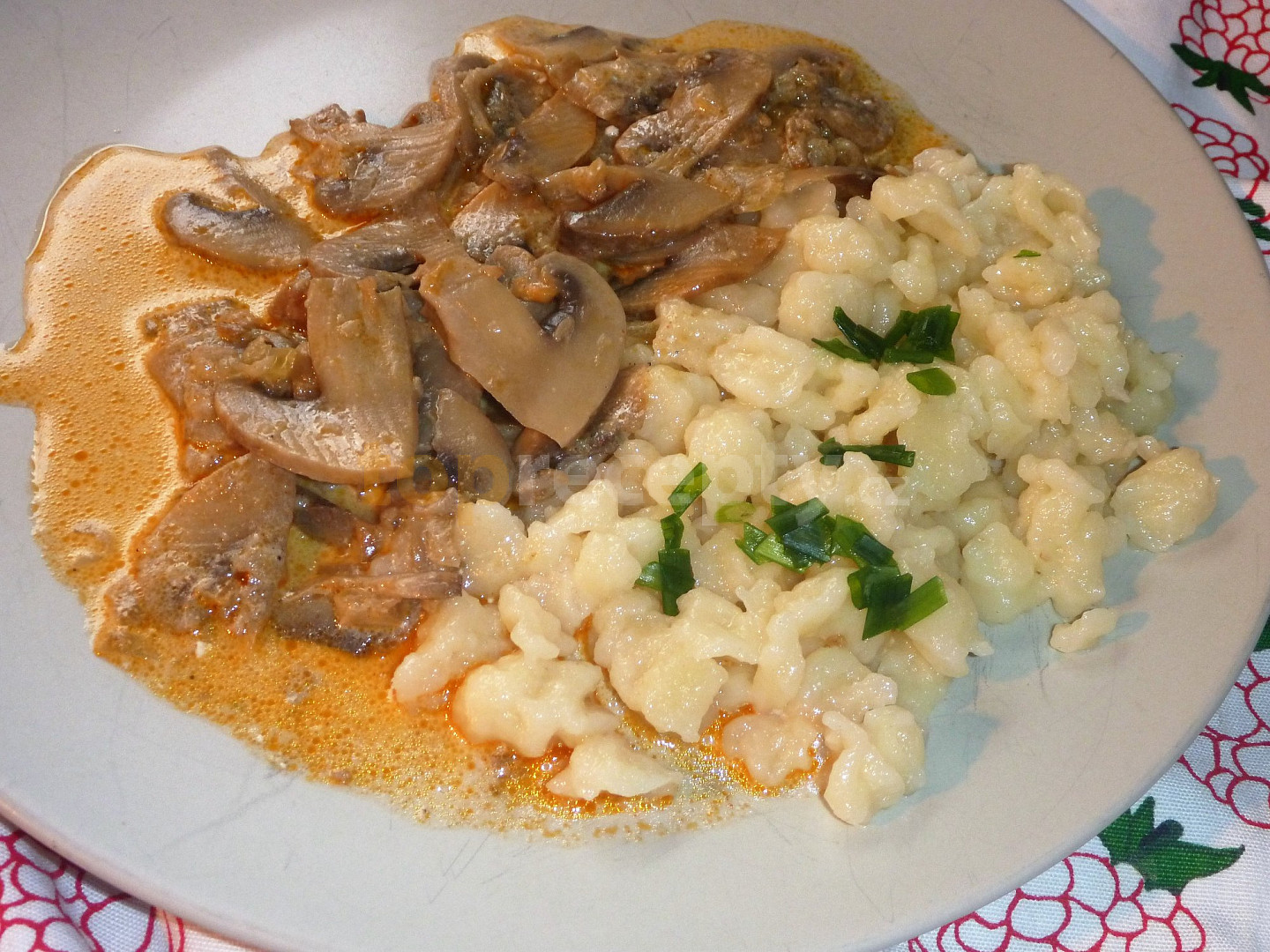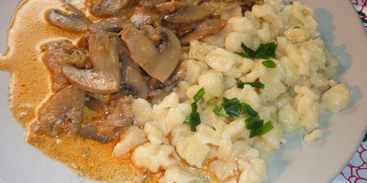 houby čerstvé, paprika čerstvá červená, rajče, česnek, cibulka, špek, sůl, pepř mletý, paprika sušená sladká, paprika sušená pálivá, bobkový list, koření nové koření, smetana, mouka hladká