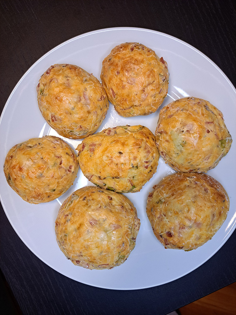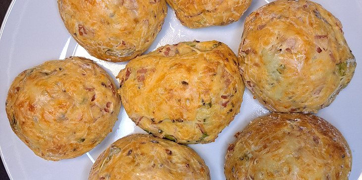 mouka hladká, vejce, tvaroh, šunka, sýr strouhaný, kypřící prášek do pečiva, čerstvé bylinky, česnek sušený, semínka lněná, sůl