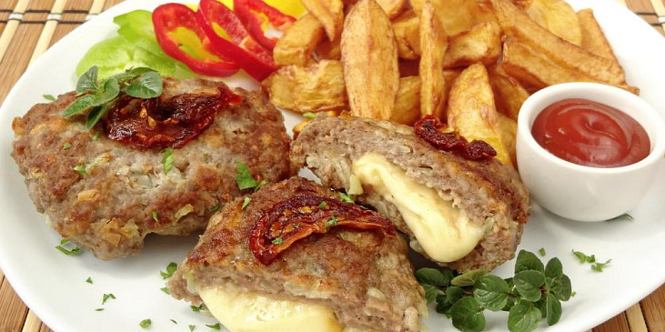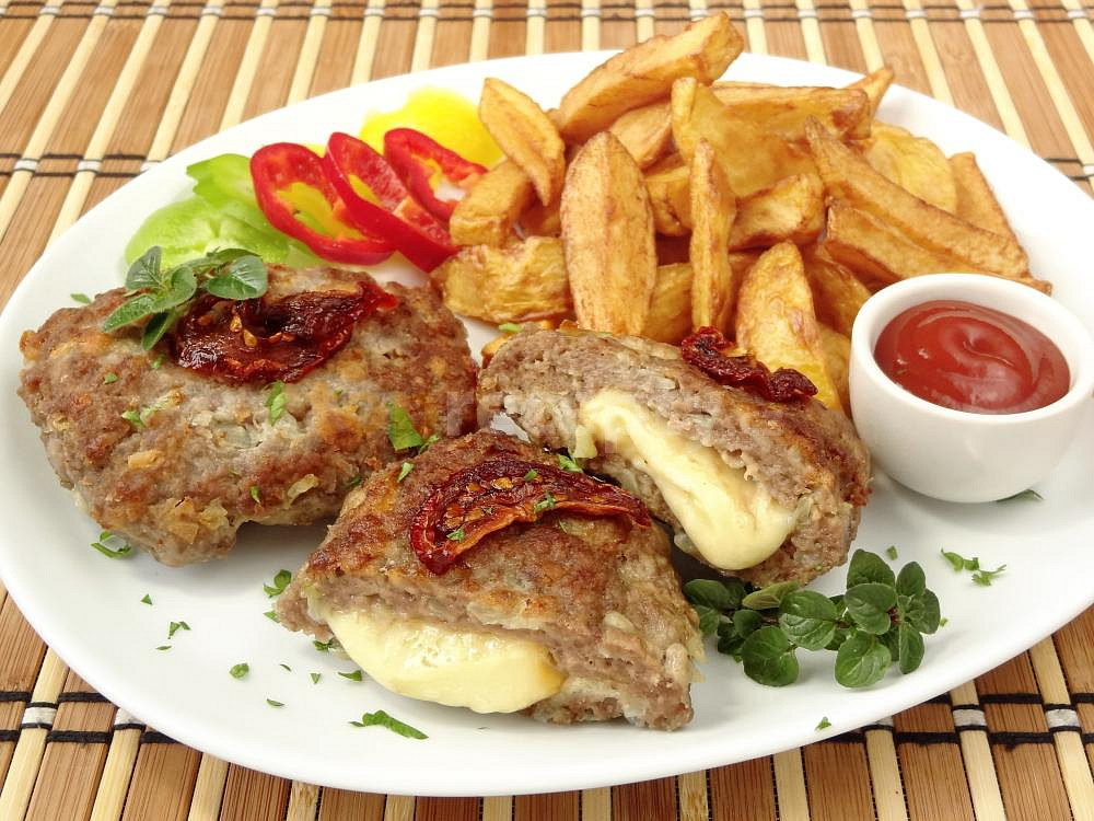 plec hovězí, cibule, sýr eidam uzený, omáčka worcesterová, voda perlivá, rajče sušené v oleji, mouka hladká, strouhanka, olej, sůl, pepř mletý, petrželka zelená, koření oregáno čerstvé