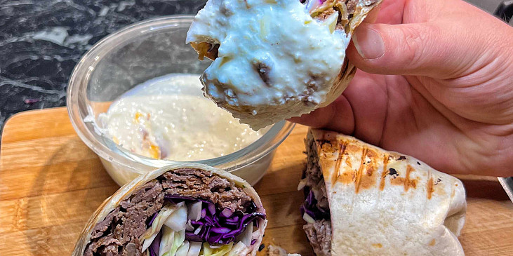 maso hovězí mleté, cibule, koření paprika maďarská, česnek sušený, cibule sušená, sůl, pepř mletý, olej olivový, jogurt řecký, tortilla, zelí bílé hlávkové, zelí hlávkové, jogurt řecký, šťáva citronová, bazalka čerstvá, sůl, pepř mletý, jogurt řecký, česnek, sůl, pepř mletý