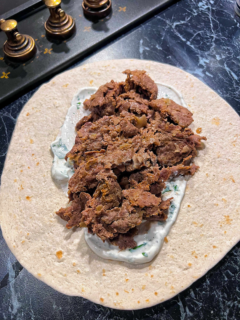 maso hovězí mleté, cibule, koření paprika maďarská, česnek sušený, cibule sušená, sůl, pepř mletý, olej olivový, jogurt řecký, tortilla, zelí bílé hlávkové, zelí hlávkové, jogurt řecký, šťáva citronová, bazalka čerstvá, sůl, pepř mletý, jogurt řecký, česnek, sůl, pepř mletý