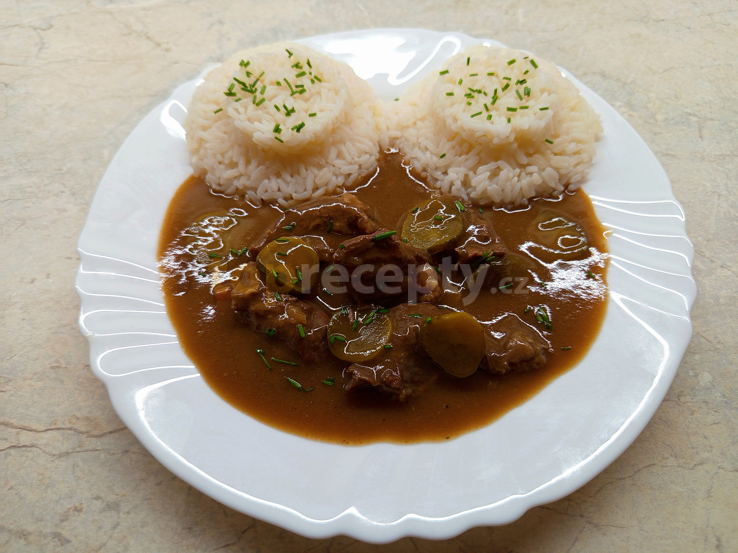 hovězí zadní, sůl, pepř mletý, sádlo, slanina, cibule, kmín drcený, vývar masový, okurka čerstvá, lák z okurek, sádlo, mouka hladká