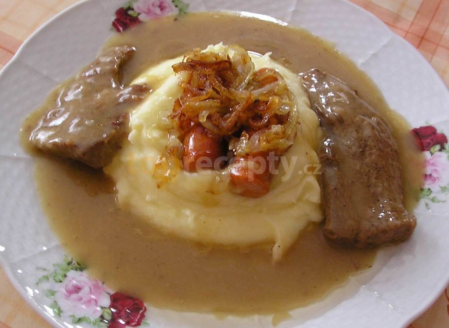 hovězí zadní, cibule, sádlo, vývar masový, pivo světlé, mouka hladká, párky, koření nové koření, sůl, pepř mletý