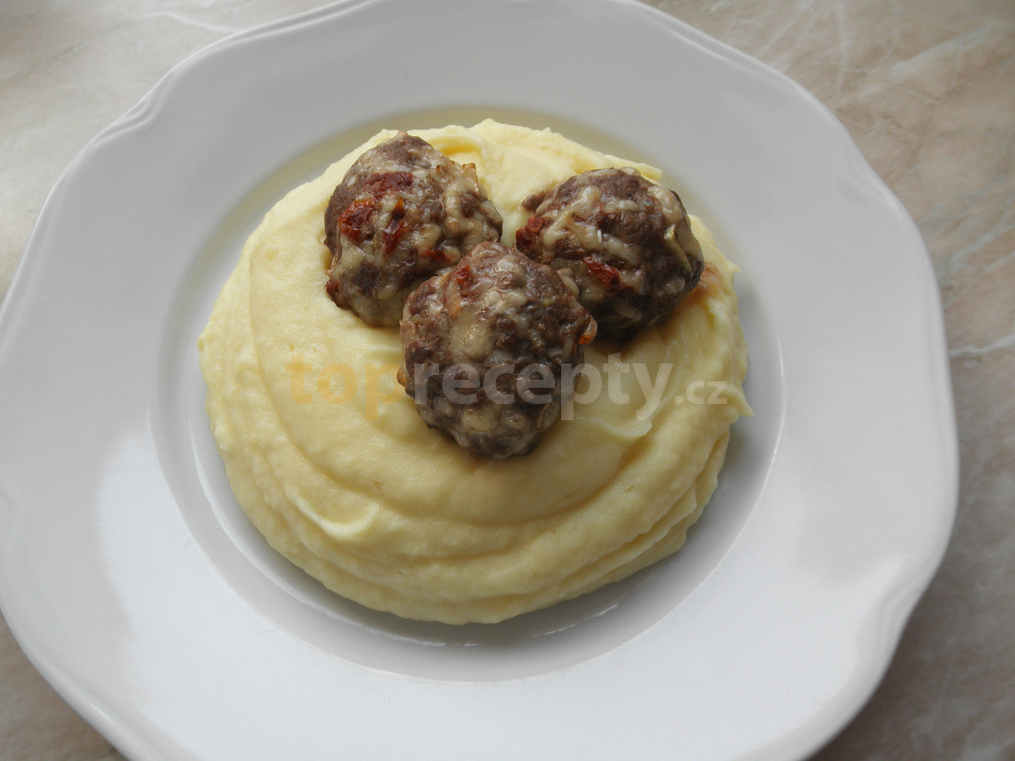 maso hovězí mleté, cibule, rajče sušené v oleji, víno bílé, sýr nastrouhaný, sůl, pepř čtyř barev