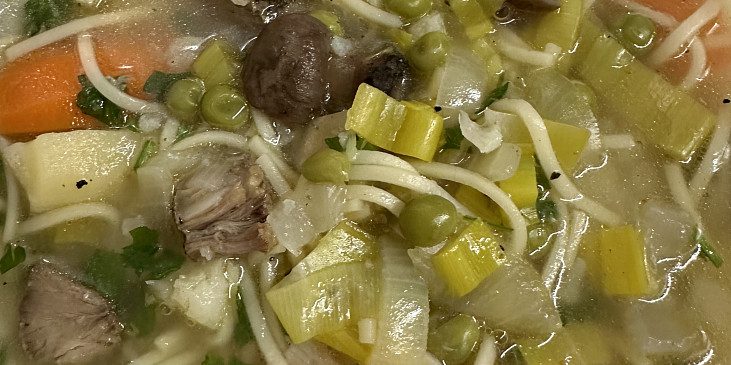 hruď hovězí, mrkev, petržel, celer, cibule, hrášek, květák, pórek, houby lesní, pepř, koření nové koření, bobkový list, máslo, nudle polévkové, sůl, petrželka