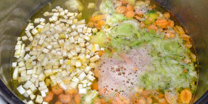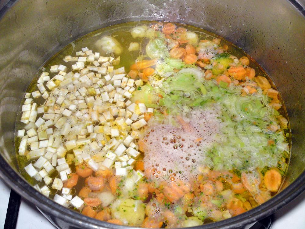 přední hovězí, kost hovězí morková, cibule, mrkev, petržel, celer, květák, pórek, máslo, vejce, mléko, mouka polohrubá, kypřící prášek do pečiva, kopřivy, česnek, olej, sůl, pepř mletý, bobkový list, koření nové koření, pepř celý, ořech muškátový, jedlé květy