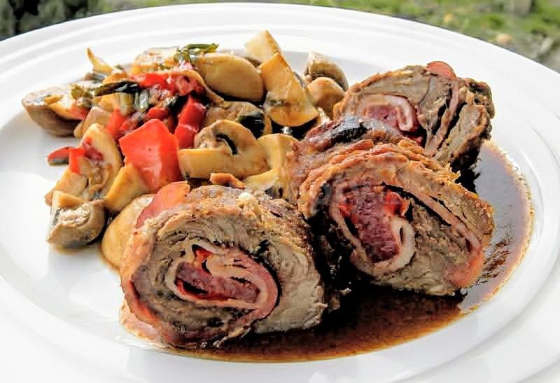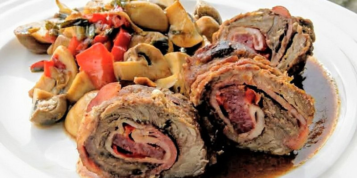 roštěná hovězí, slanina, klobása, kapie, cibule, česnek, rozmarýn, sádlo, hořčice plnotučná, sůl, pepř mletý, žampióny, paprika, cibule, ghee, sůl, pepř mletý, petrželka