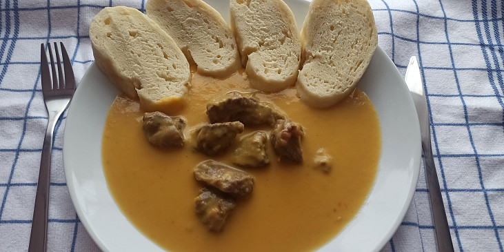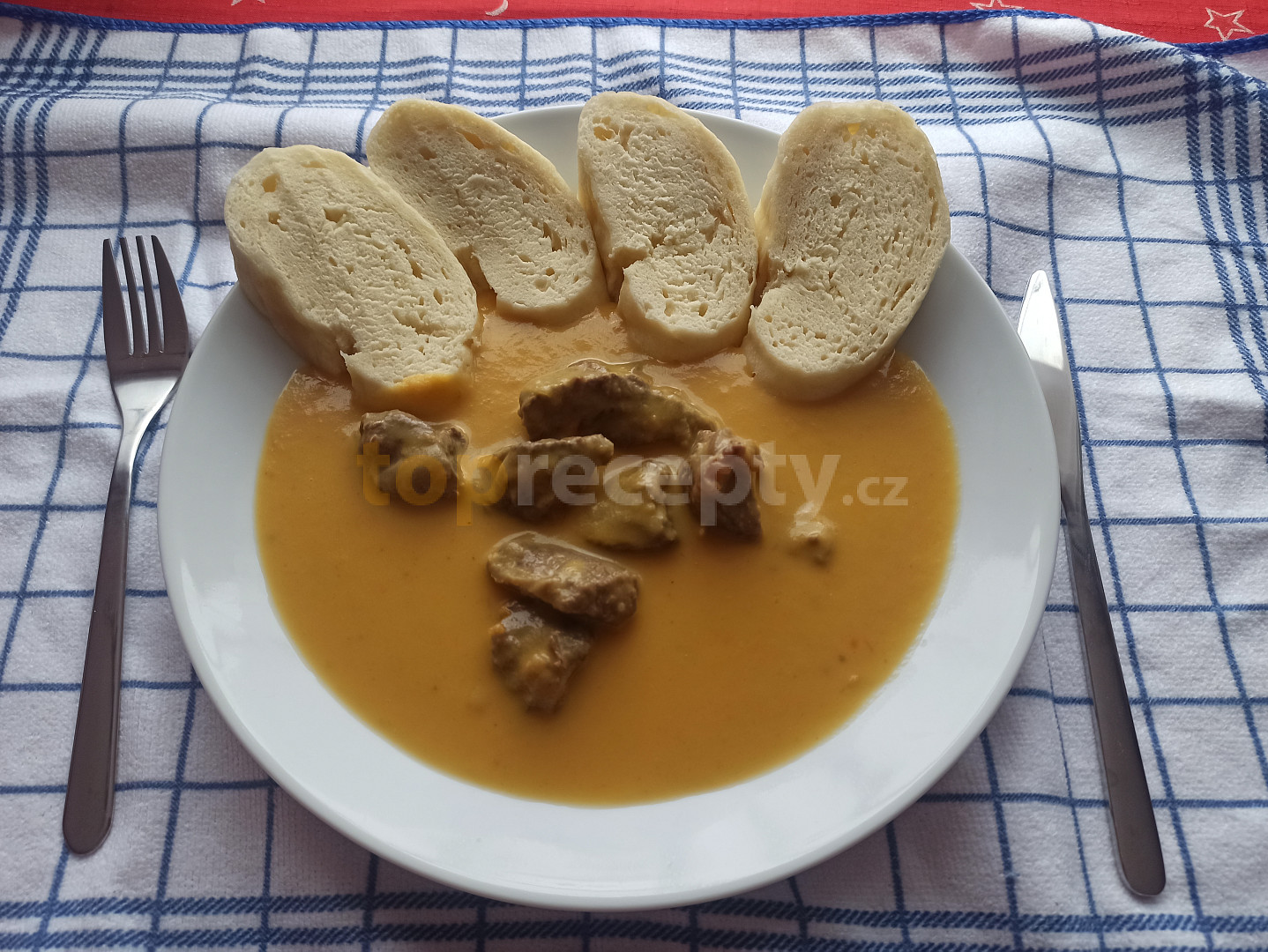 plátek hovězí, hořčice plnotučná, mrkev, petržel, celer, cibule, pepř celý, koření nové koření, bobkový list, cukr krupice, šťáva citronová, ocet, vývar masový, smetana ke šlehání, sůl, olej, mouka hladká, mléko