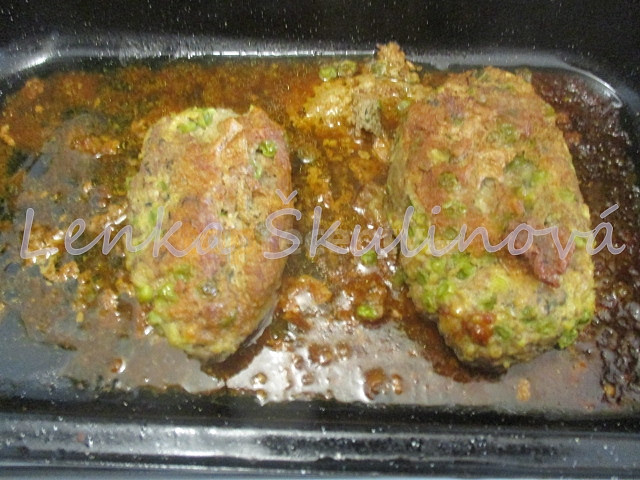 maso vepřové mleté, česnek, cibule, hrášek mražený, vejce, polenta, tymián sušený, sůl, pepř, olej, vývar masový, polenta