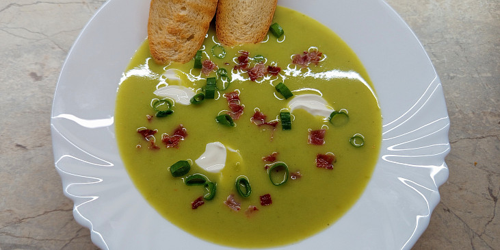 hrášek mražený, pórek, brambory, cibule, olej, voda, vegeta, sůl, pepř mletý, smetana zakysaná, slanina, rohlík, bylinky
