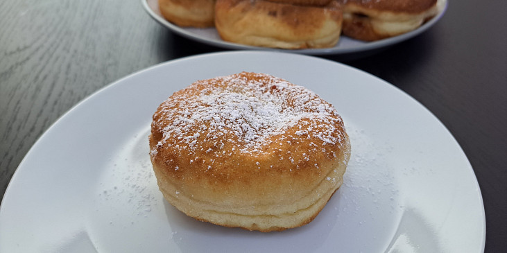 voda, cukr krupice, droždí čerstvé, žloutek, máslo, mouka hladká, rum, cukr vanilkový, sůl, marmeláda, tuk na smažení, cukr moučkový