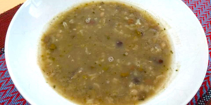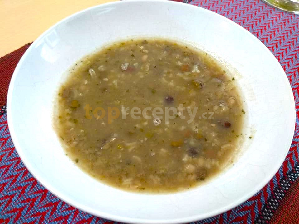 hrách, čočka, fazole, kroupy, zelenina kořenová, cibule, olej, mouka hladká, voda, česnek, sůl, pepř mletý, majoránka