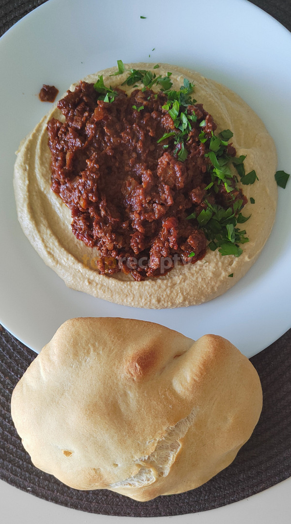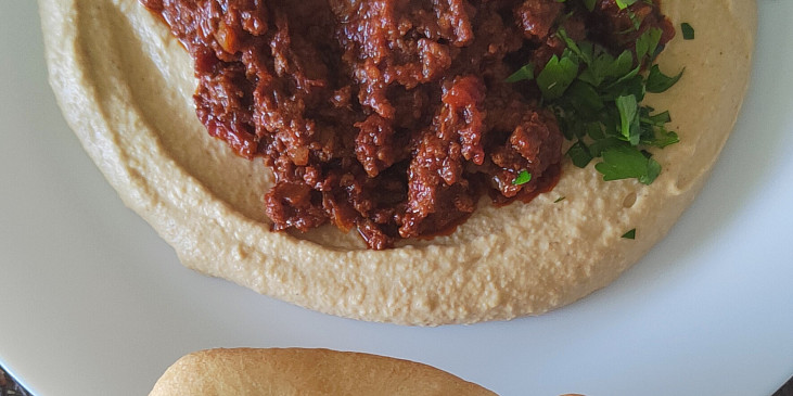 maso hovězí mleté, cibule, česnek, římský kmín mletý, paprika sušená sladká, koření hřebíček, vločky chilli, protlak rajčatový, rajče drcené, cukr třtinový, sůl, pepř mletý, olej olivový, koriandr čerstvý, cizrna, tahini, česnek, římský kmín mletý, šťáva citronová, voda, sůl