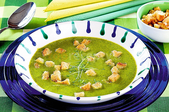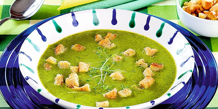 špenát listový mražený, žloutek, máslo, mouka hladká, cibule, česnek, smetana ke šlehání, ořech muškátový, sůl, pepř mletý, řeřicha, krutony