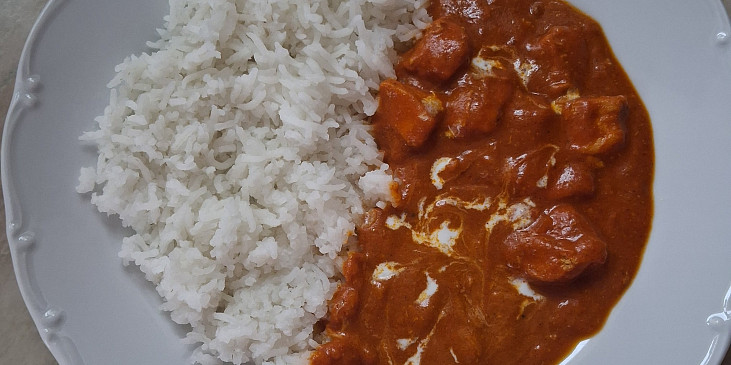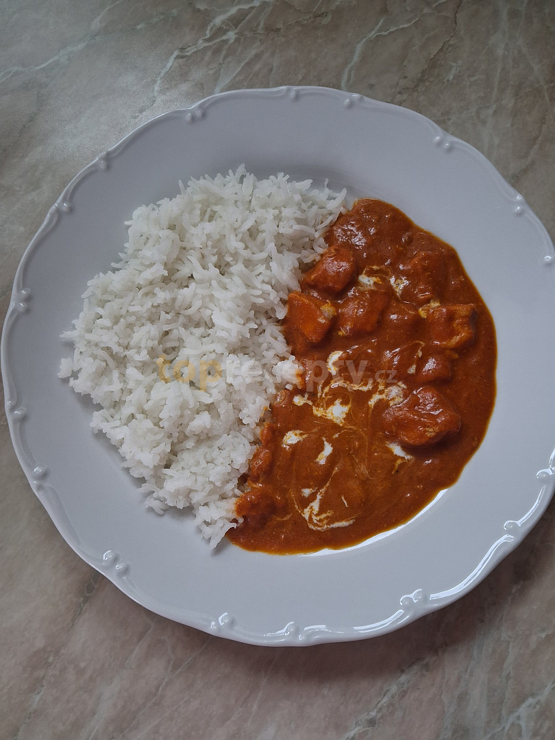 pyré rajčatové, prsa kuřecí, cibule šalotka, skořice mletá, cukr třtinový, koření garam masala, koření tandoori masalo, koření kari, kurkuma, smetana ke šlehání, mléko kokosové, sůl, pepř mletý