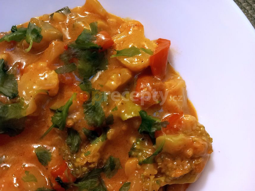 olej olivový, květák, brokolice, kapie červená, paprika čerstvá bílá, česnek, zázvor, pasta rajčatová, kmín drcený, koření kari, kurkuma, mléko kokosové, vývar masový, koriandr čerstvý, šťáva limetková