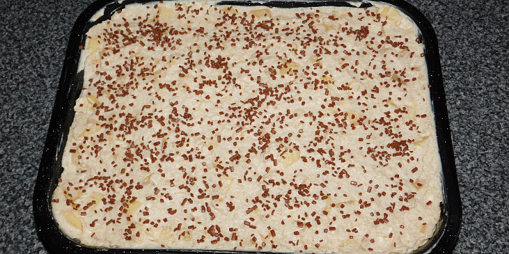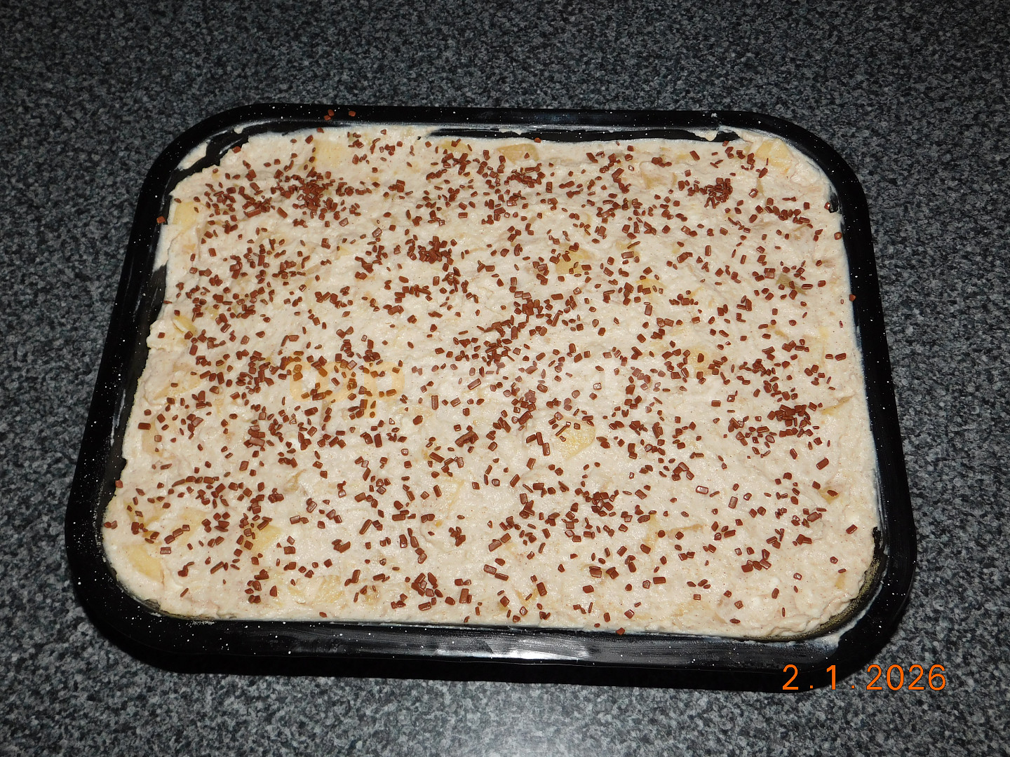 vejce, cukr krupice, mouka polohrubá, kypřící prášek do pečiva, olej, voda, kakao, jablko, máslo, šťáva citronová, skořice, cukr vanilkový, voda, cukr krupice, pudink kokosový, ztužovač šlehačky, smetana ke šlehání, smetana zakysaná, tuk, mouka hrubá