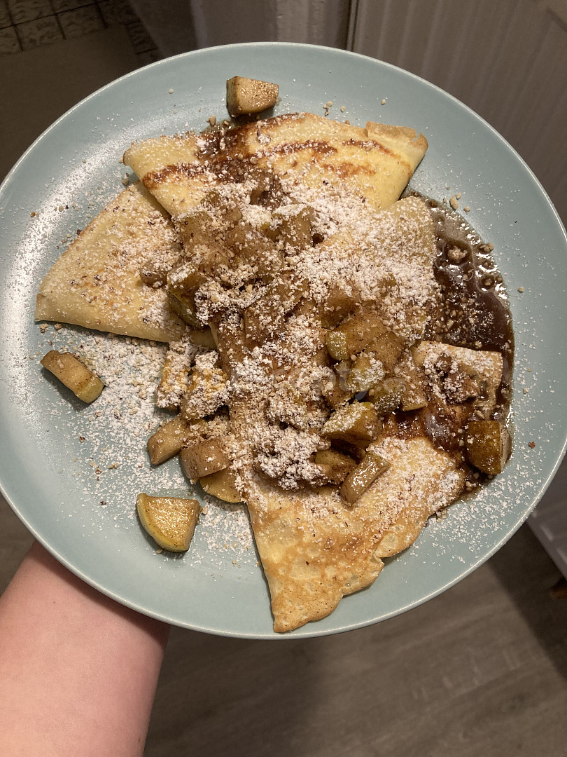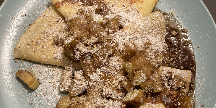 mléko, vejce, mouka polohrubá, jablko, skořice mletá, cukr vanilkový, cukr krystal, sůl, šťáva citronová, čokoláda, šlehačka, tuk na smažení