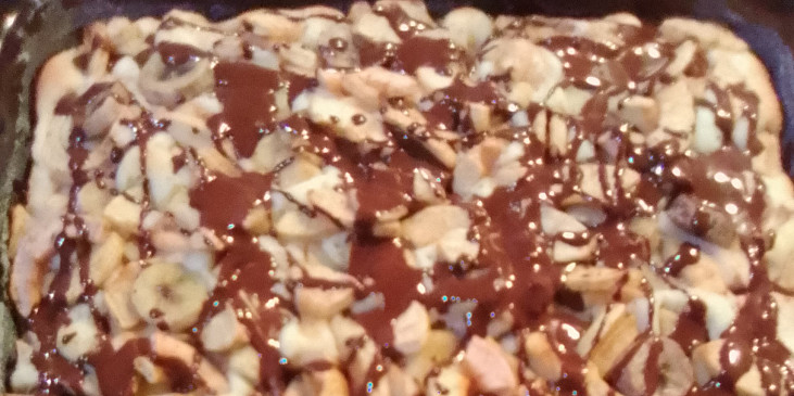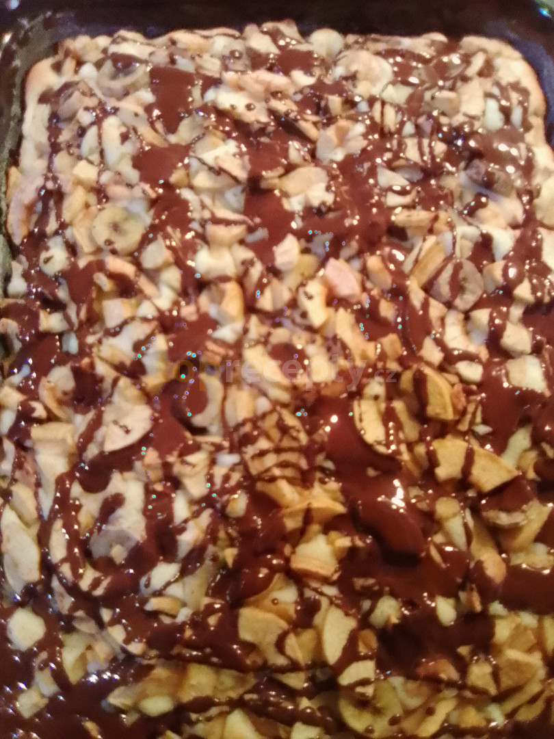mouka polohrubá, cukr krupice, vejce, olej, prášek do pečiva, voda, rum, čokoláda na vaření, jablko, banán, cukr moučkový, šťáva citronová, skořice