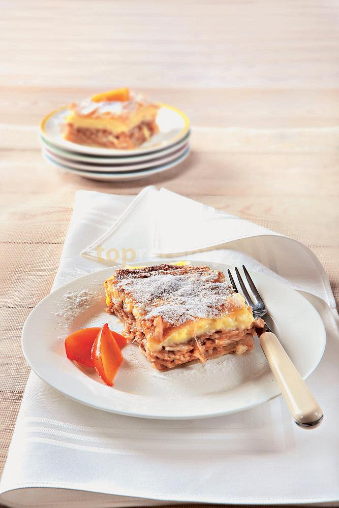 těsto listové, piškoty, jablko, cukr krupice, mléko plnotučné, cukr vanilkový, pudink vanilkový, ořechy vlašské, mouka hladká, skořice mletá, máslo, cukr moučkový