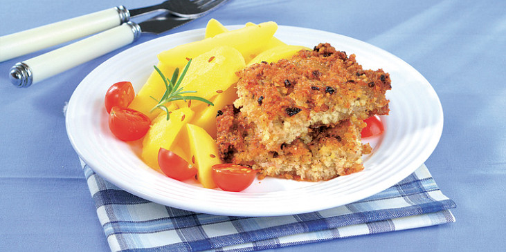 koleno vepřové, jáhly, sádlo, cibule, česnek, bobkový list, pepř černý, koření nové koření, kmín drcený, olej, majoránka, pepř mletý, sůl, sádlo, strouhanka