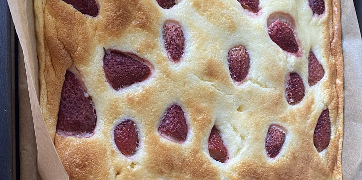 mouka polohrubá, cukr krupice, cukr vanilkový, prášek do pečiva, vejce, mandlové aroma, olej, mléko, jahody, smetana kysaná, vejce, cukr moučkový, kůra citronová, meduňka