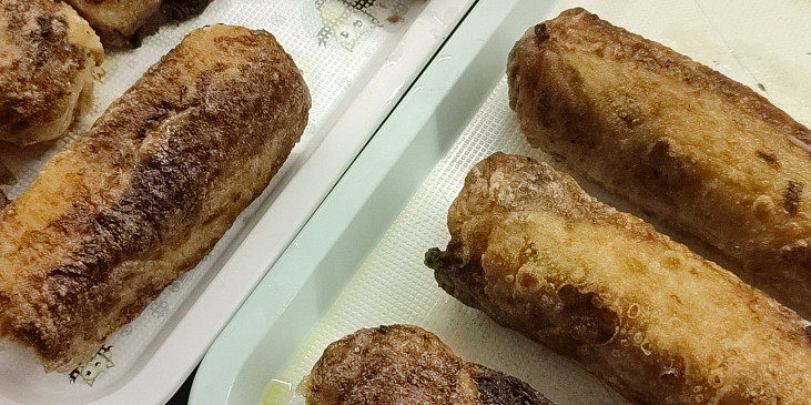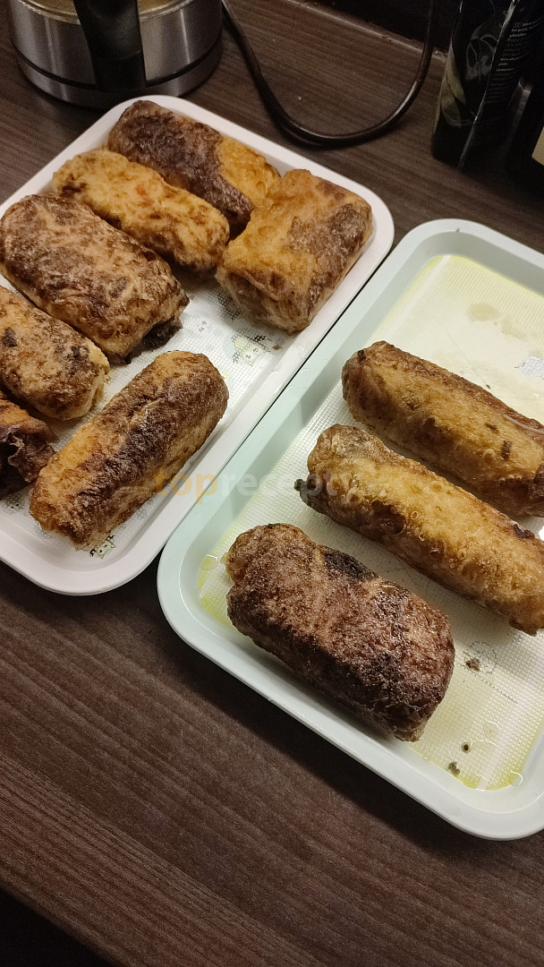 maso mleté, vejce, mrkev, kedlubna, cibule, sůl, omáčka sojová, pepř mletý, jidášovo ucho, nudle rýžové, papír rýžový, olej, pivo světlé