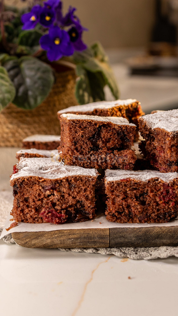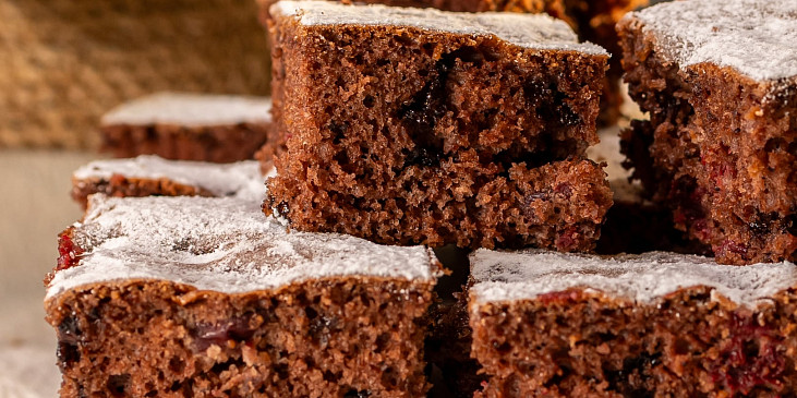 mouka polohrubá, cukr krupice, olej, mléko, kypřící prášek do pečiva, vejce, kakao, ovoce, drobenka