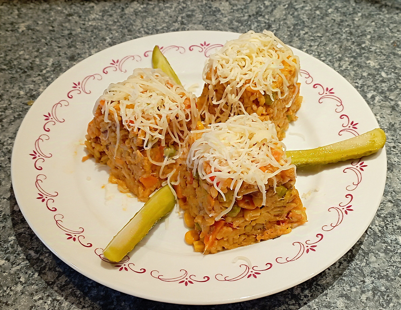 maso mleté, olej, cibule, česnek, kapie sterilovaná, hrášek mražený, protlak rajčatový, paprika sušená sladká, cukr třtinový, sůl, pepř mletý, rýže, sýr tvrdý, okurky sterilované