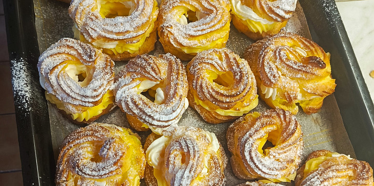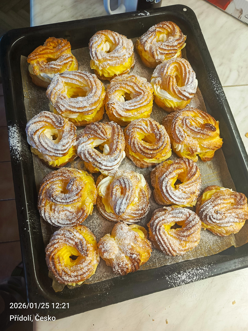 voda, máslo, sůl, mouka polohrubá, vejce, mléko, pudink vanilkový, cukr moučkový, máslo, rum