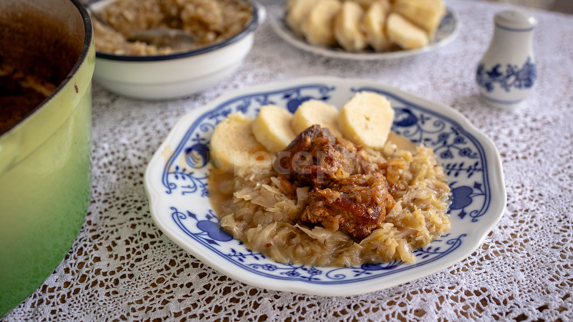 plec vepřová, cibule, zelí sterilované, mouka hladká, kmín celý, cukr krystal, paprika sušená sladká, omáčka sojová, olej, voda, sůl, pepř mletý
