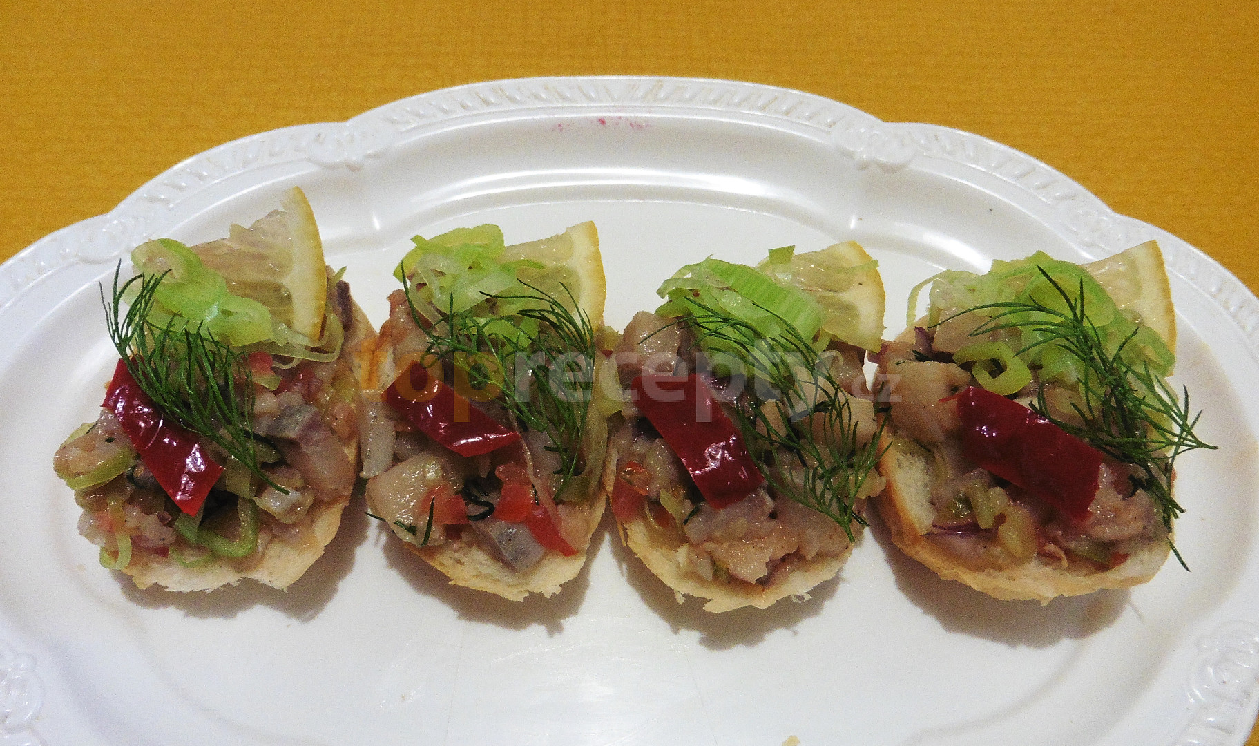 matjesy v oleji, cibule červená, okurky sterilované, rajče cherry, olej olivový, hořčice dijonská, citron, pórek, kopr, sůl, pepř mletý, paprika kozí roh, citron, kopr, rohlík